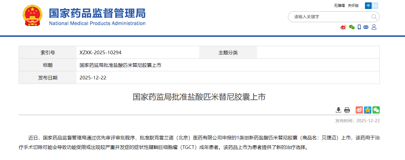 12月22日,默克晓喻,其预防营业化的翻新药物盐酸匹米替尼胶囊(商品名:贝捷迈)已获中国国度药品监督不停局(NMPA)批准上市。该药用于调养手术切除可能导致功能受限或严重并发症的症状性腱鞘巨细胞瘤(TGCT)成年患者。看成国内首个亦然现在惟一获批用于该相宜症的一类翻新靶向药,贝捷迈的上市填补了临床调养空缺。
